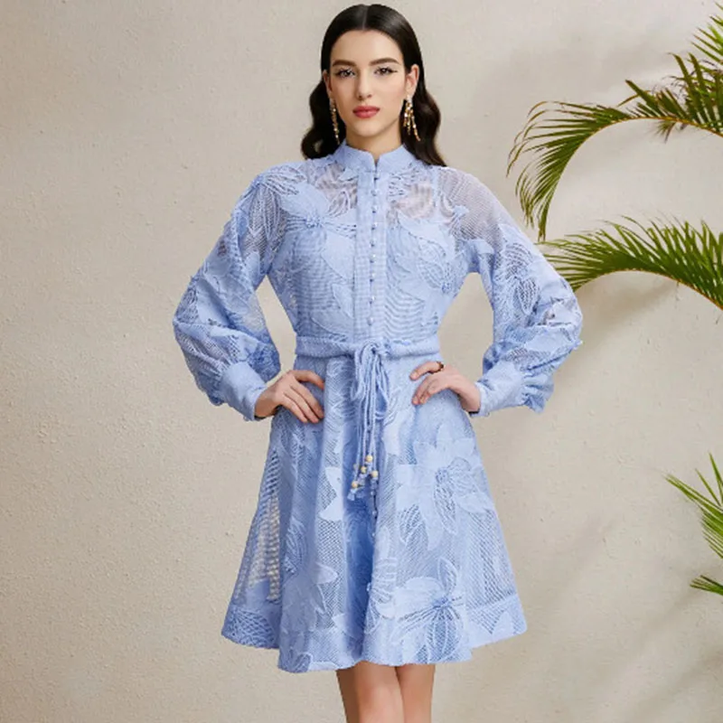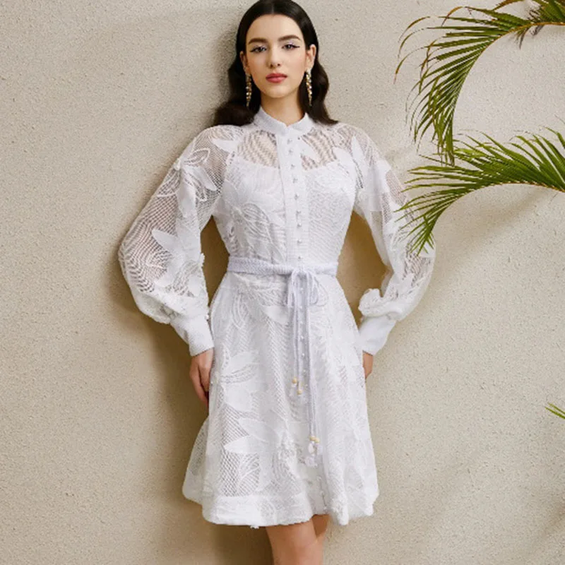 Elegant Single Breasted Mini dress With Belt Women 2025 New Spring Luxury Lantern Long Sleeve Embroidery Dresses White Vestidos